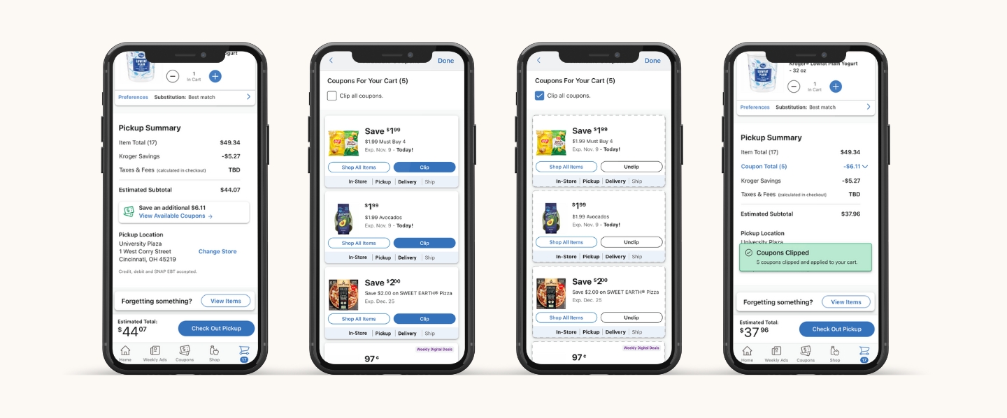 - Personalization: Clicking the CTA opens a tailored list of coupons with a global "Clip All" checkbox for maximum efficiency.